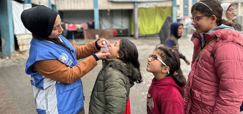 © UNRWA/Mohammed Hinnawi En febrero de 2025, unos niños de Gaza reciben la vacuna contra la poliomielitis de manos de un trabajador de la ONU.
